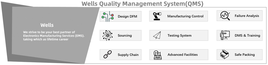 Wells built a Quality Management System (QMS) to ensure excellent delivery of printed circuit boards and assembled products. Our QMS structure looks like this: