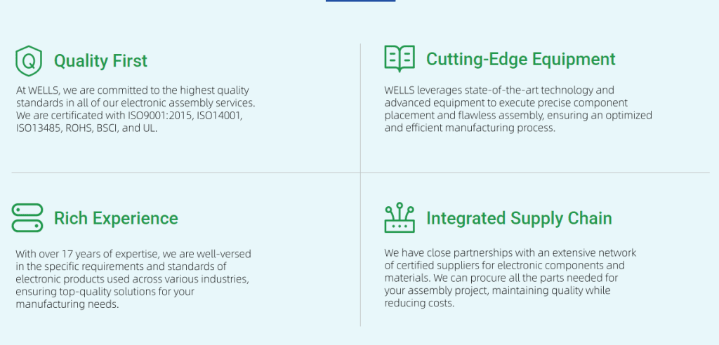 Wells è il vostro partner di fiducia e il vostro negozio unico per la produzione di PCB, l'approvvigionamento di componenti, l'assemblaggio di PCB e la produzione elettronica. Con oltre 16 anni di esperienza, abbiamo fornito PCB di alta qualità a prezzi competitivi per oltre 1000 clienti in tutto il mondo. La nostra azienda è certificata ISO9001:2015 e UL Listed, e tutti i nostri prodotti sono testati 100% E e ispezionati da AOI e X-RAY per soddisfare i più alti standard industriali. Quindi, richiedete subito un preventivo immediato al nostro team di vendita e noi ci occuperemo del resto.